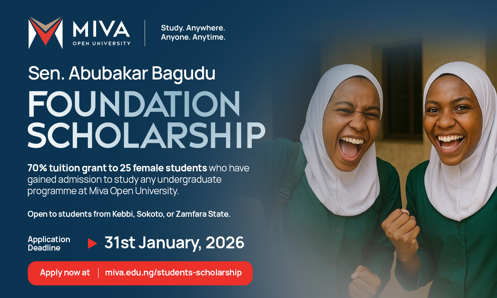 Are you a determined female student from Kebbi, Sokoto, or Zamfara state who dreams of earning a university degree but lacks the financial means? The Senator Abubakar Bagudu Foundation Scholarship at Miva Open University is here to help you turn your dreams into reality.